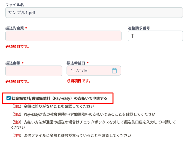 - カード後払い申請画面に進んだら、「社会保険料/労働保険料(Pay-easy)の支払いで申請する」にチェックを入れ、必須項目の入力に進みます。